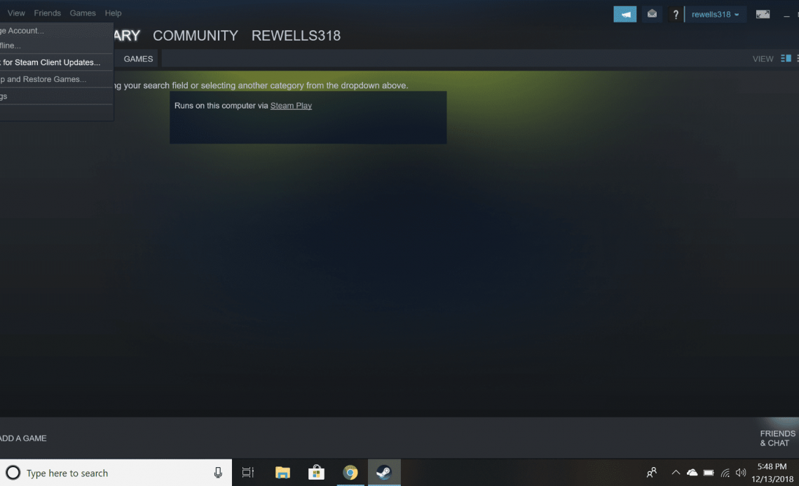 Выберите Steam в верхнем левом углу окна, чтобы открыть раскрывающееся меню, затем выберите « Проверить обновления клиента Steam» .