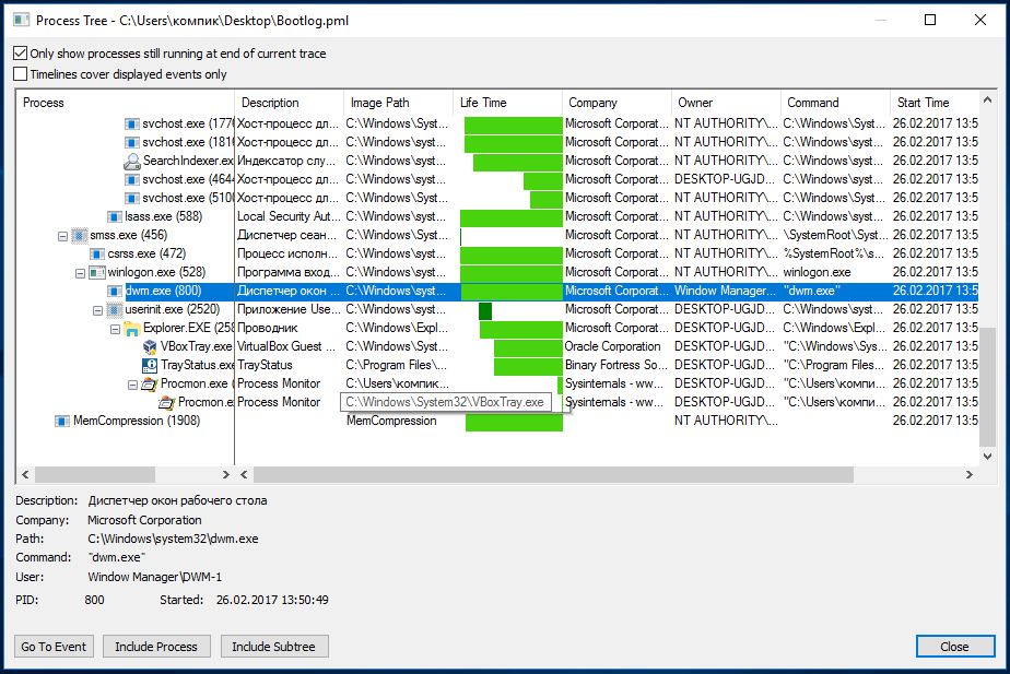 Для более детального анализа можно воспользоваться опцией Process Tree из меню Tools, отображающей процессы в виде древовидного списка с указанием дополнительных сведений о продолжительности, времени старта и завершения каждого процесса.