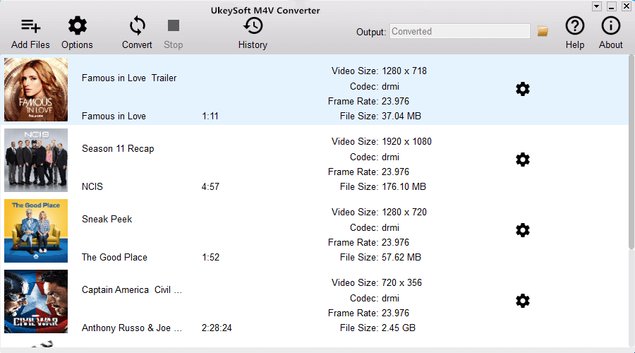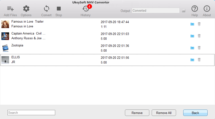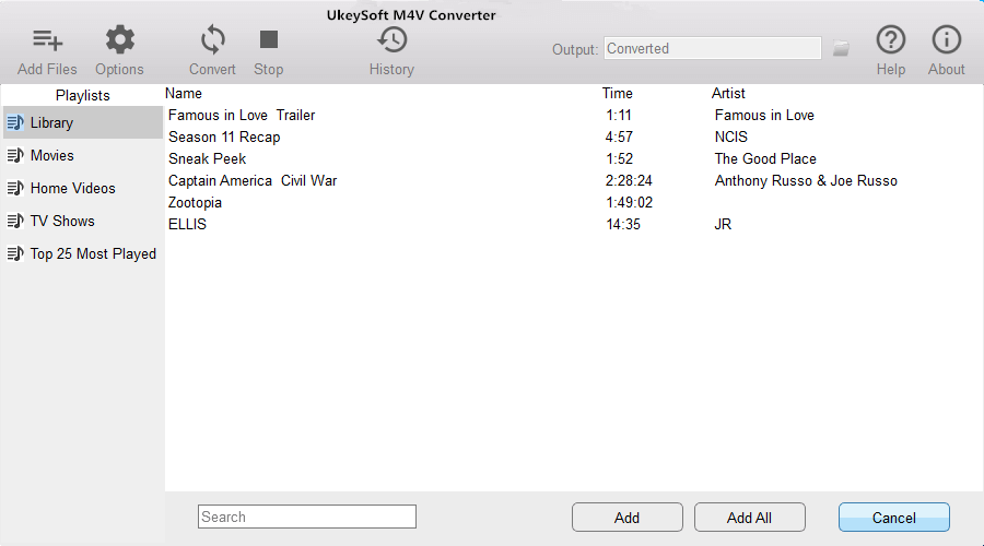 Запустите UkeySoft M4V Converter, вы увидите интерфейс iTunes. Нажмите кнопку «Добавить файлы», и все ваши фильмы iTunes, телешоу и музыкальные видео будут синхронизированы с конвертером.