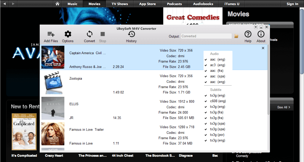 Все оригинальные Dolby 5.1 Audio, AD, многоязычные аудиодорожки, субтитры и субтитры, содержащиеся в фильме iTunes, будут сохранены в выходном формате MP4 без DRM. Вы можете нажать кнопку передач, чтобы выбрать, какие из них сохранить.