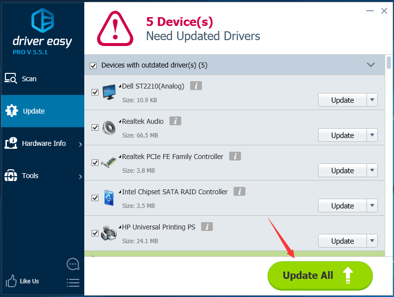 Водитель Easy это чрезвычайно безопасный и полезный инструмент для работы с драйверами. Это может помочь вам отсканировать все отсутствующие и устаревшие драйверы и найти подходящие для вас. С этими Бесплатная версия , вы можете установить новый драйвер по очереди. Но если перейти на его Pro версия , все ваши драйверы можно обновить одним щелчком мыши — Обновить все .