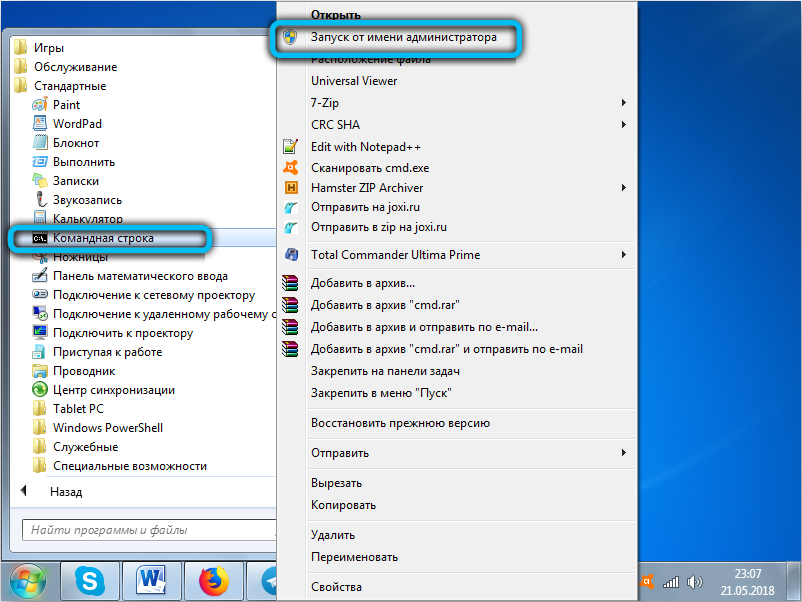 Для этого в ранних версиях Windows (вплоть до «семёрки») необходимо кликнуть по кнопке «Пуск», выбрать пункт «Все программы», пролистать список вниз до подпункта «Стандартные» и найти там «Командную строку». Кликнуть по ней ПКМ и в появившемся контекстном меню выбрать пункт «Запуск от имени администратора».