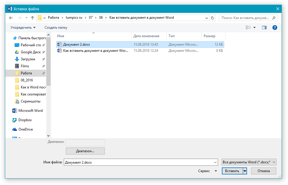 3) В итоге в Ворде появится окно «Специальная вставка»: