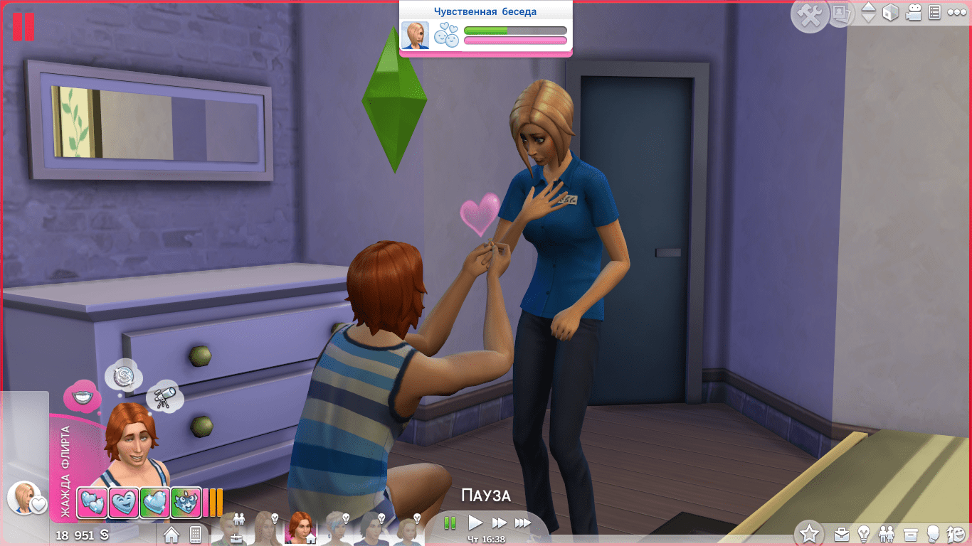 Его эмоции и желания находятся на панели внизу. Разные окошки покажут вам его потребности или желания. При общении с другими симами вы будете выбирать варианты диалога. Отчего будет зависеть ваше с ним отношение. В остальном нужно просто играть в этом мире и открывать для себя его возможности. На самом деле разнообразных занятий масса, так просто трудно их перечислить вы всегда сможете открыть что-то новое. Вы можете строить карьеру, добиваться успеха в любой сфере вроде повара, певца, писателя и т.д. Можете развивать навык у сима играть на гитаре, читать, играть в шахматы заниматься спортом, это будет его развивать и менять. Можно строить с другими отношения, дружеские, любовные и даже вражеские, в последнее части появились даже кружки по интересам, в которых люди встречаются и вместе развивают навыки или отдыхают.