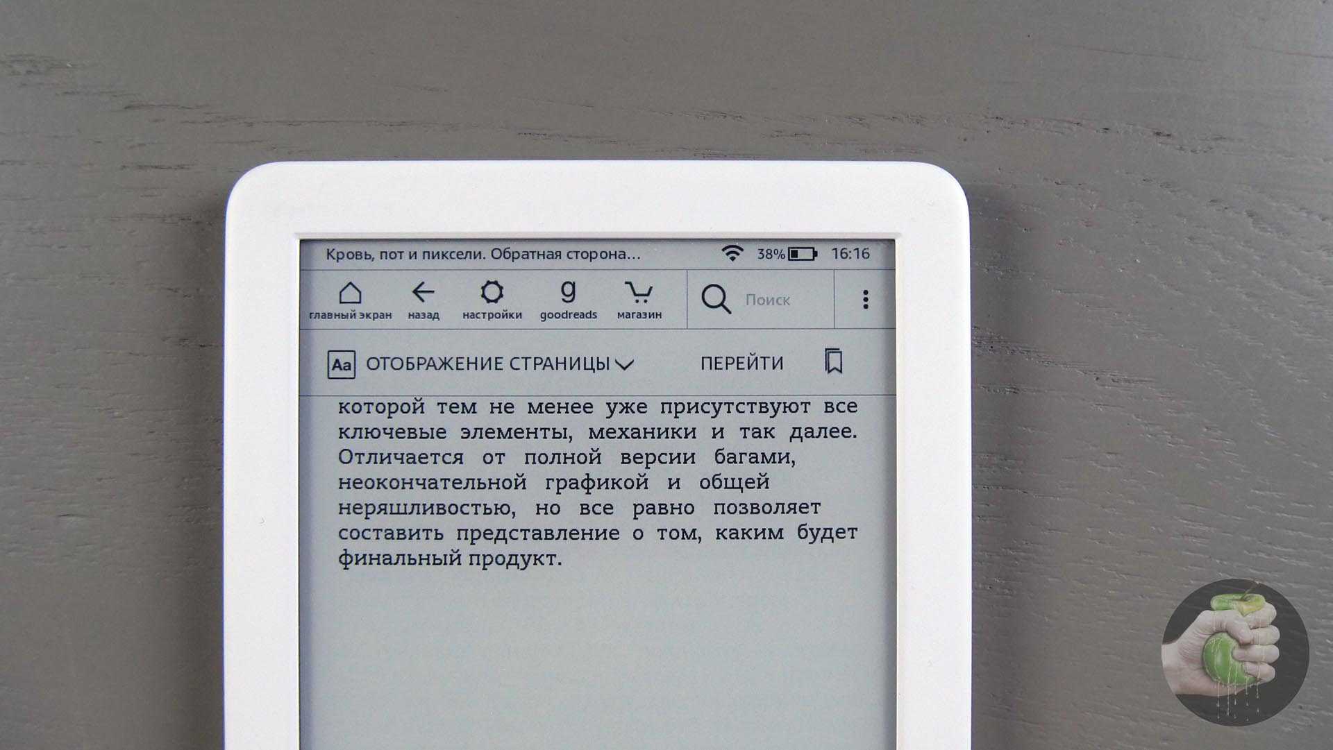Во-вторых, с сенсорным экраном изменился способ взаимодействия с устройством. И он тут абсолютно неинтуитивный. Например, вы читаете книгу и наталкиваетесь на сноску. Ну интересно же, что имел в виду автор! Тыкаете, и вас перенаправляет в самый конец книги. То есть туда, где и содержатся все сноски. Как вернуться назад? У Kindle 4 была специальная кнопка «Назад». Тут же вы тапаете по верхнему краю экрана и там тапаете по кнопке «Назад».