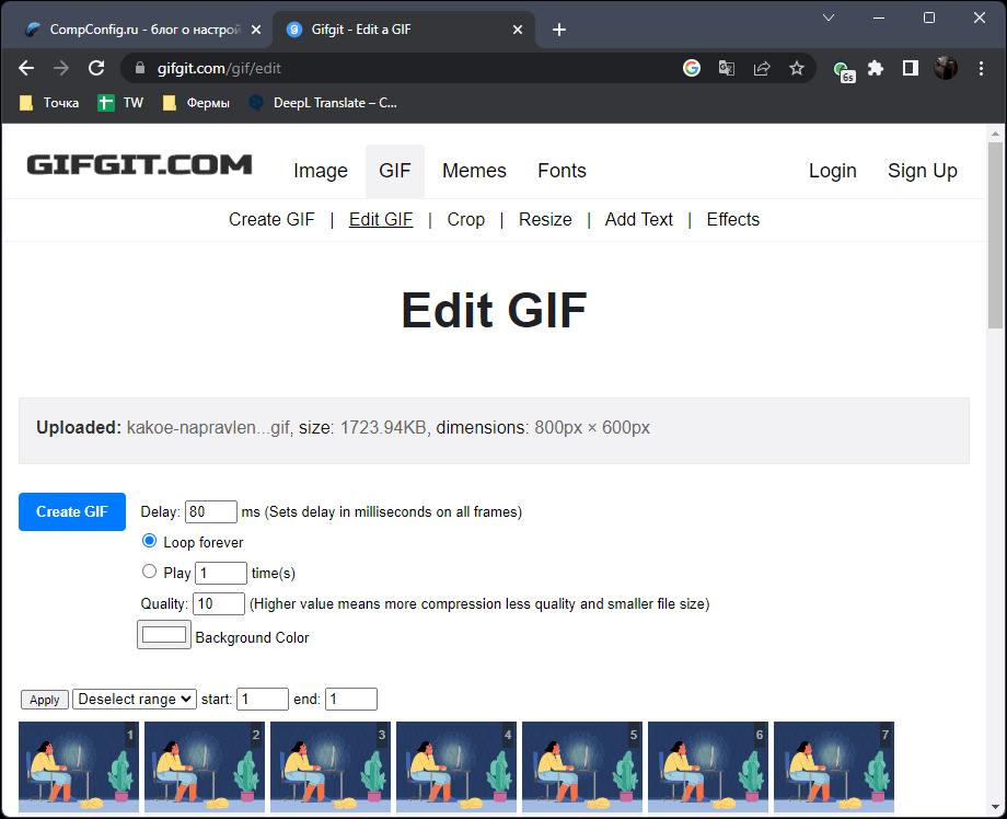 Данный веб-сервис может оказаться полезным, если вы хотите самостоятельно быстро создать гифку из кадров или изменить их последовательность в существующем файле. Для этого понадобится выбрать каждую миниатюру, перетащить ее или удалить их списка. Вместе с этим поддерживается установка задержки между переключением кадров, выбор количества последовательных воспроизведений, изменение качества и цвета фона, если речь идет о прозрачной гифке.