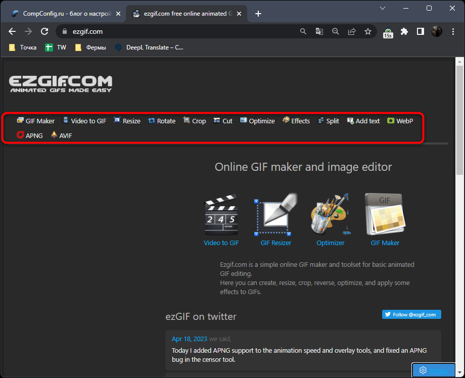 Откройте Ezgif и запустите онлайн-инструмент в своем браузере.