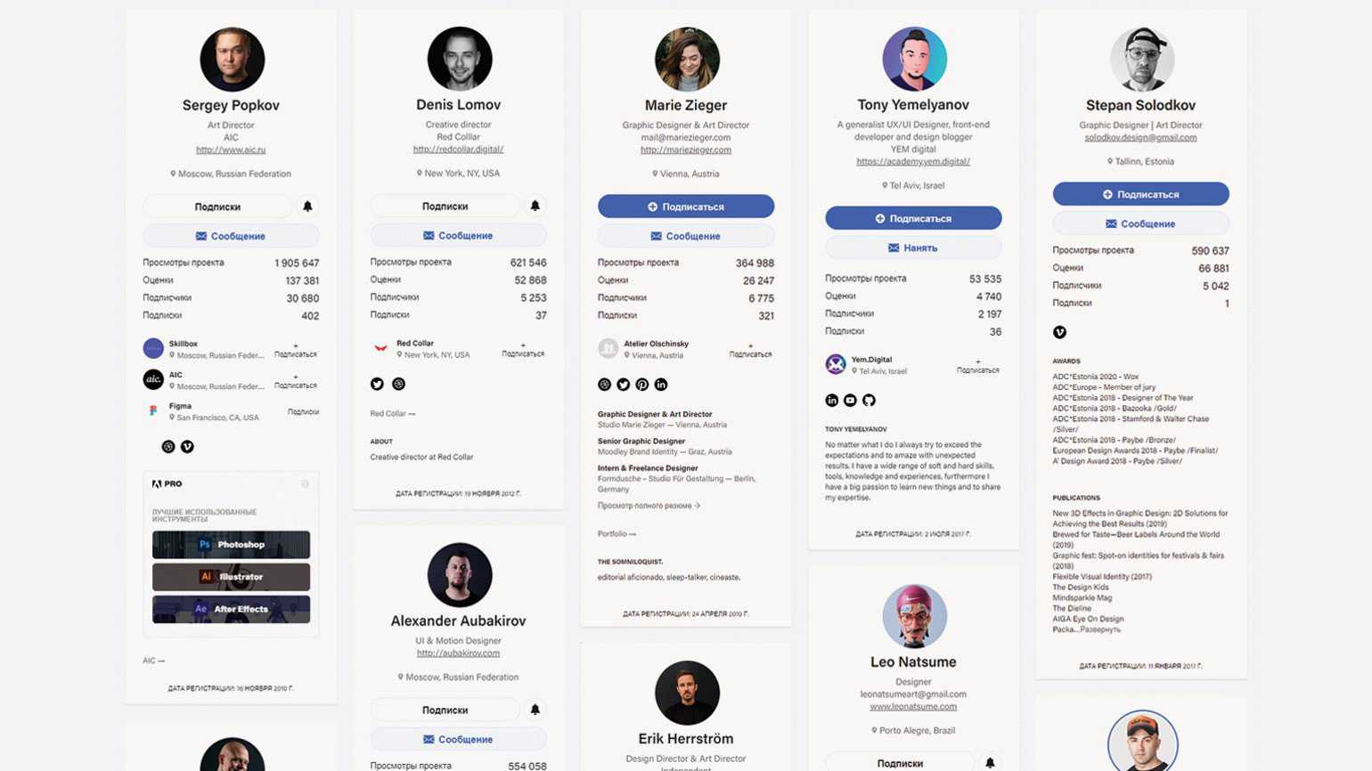 Примеры оформления Behance-профилей разных авторов. Скриншот: сайт Behance