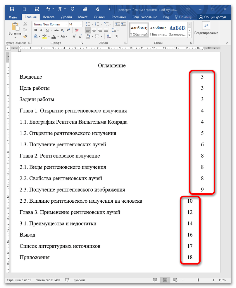 Пропишите вручную содержание и укажите страницы, на которых находятся главы и подзаголовки. Учтите, между названием разделов и номером не должно быть никаких знаков и пробелов (их нужно написать слитно). Установите курсор между окончанием последнего слова и числом в строке.
