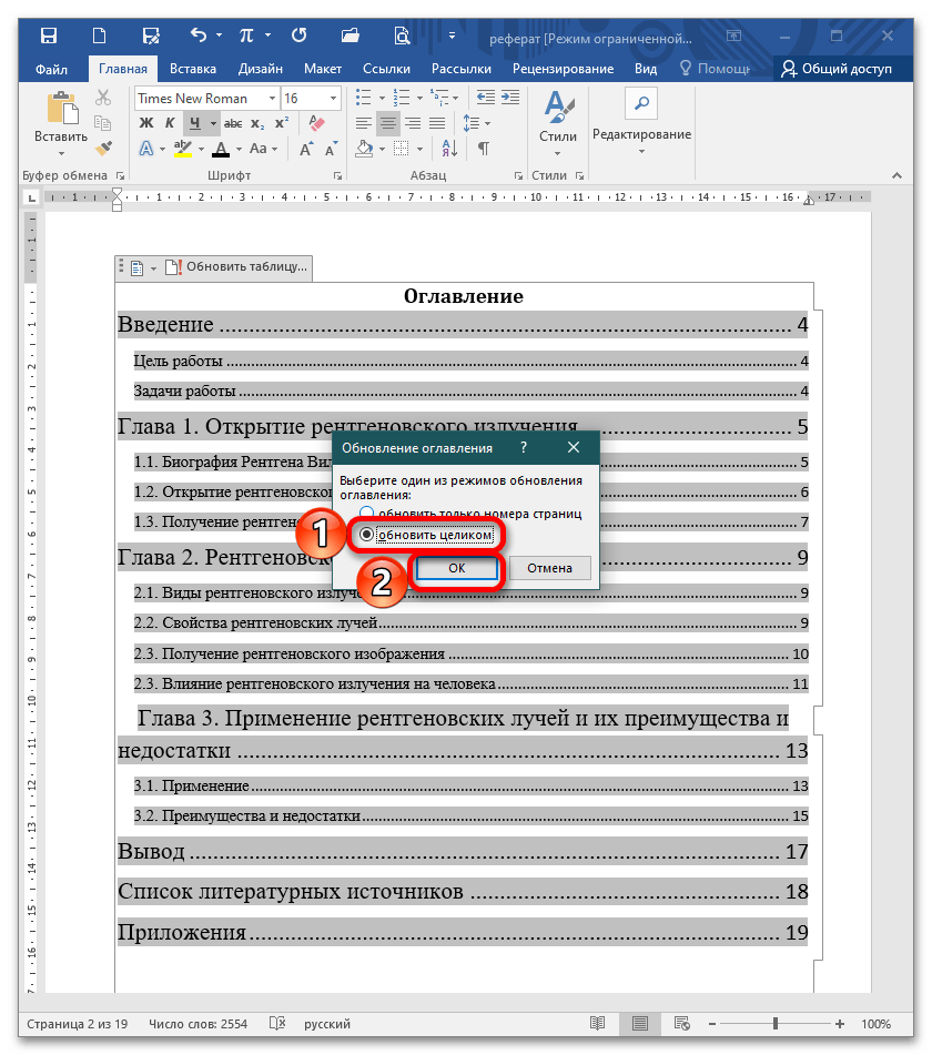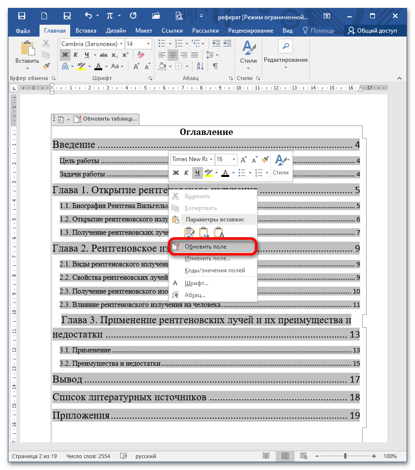 Если по ходу редактирования текста изменились номера страниц подзаголовков, содержание можно обновить в автоматическом режиме. Для этого кликните по нему правой кнопкой мыши и выберите пункт «Обновить поле».