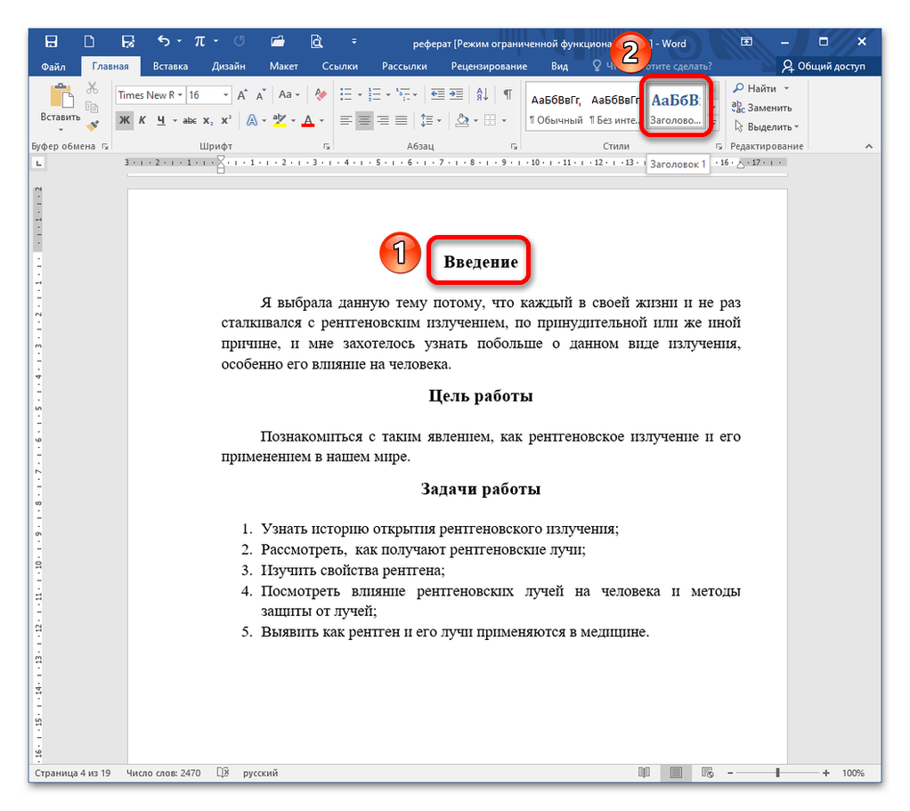 - Откройте документ. Перейдите к первой главе и убедитесь, что ее название отредактировано в соответствующем стиле. Например, при выделении слова «Введение» на панели инструментов в блоке «Стили» отображается «Заголовок 1». Если подсвечивается окно с названием «Обычный», кликните на необходимую опцию, предварительно выделив наименование главы или раздела.