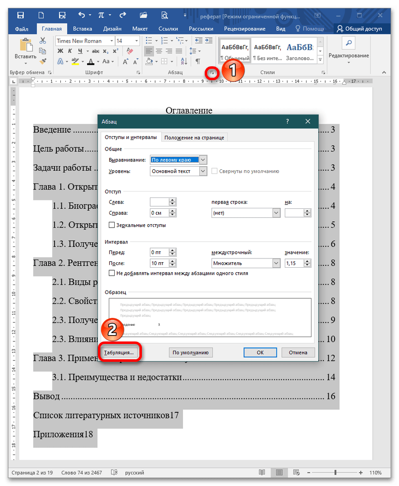 - Сформируйте оглавление без использования знака табуляции. Выделите текст, раскройте панель «Абзац» в ленте и щелкните на кнопку «Табуляция».