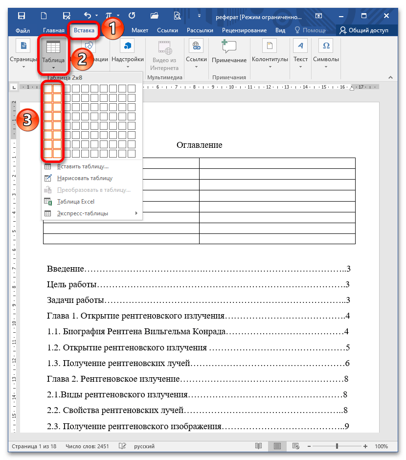 - Откройте документ, подлежащий редактированию, и перейдите во вкладку «Вставка». В блоке «Таблица» раскройте список и выделите 2 столбца и все строки, показанные на пиктограмме, либо самостоятельно (пункт «Вставить таблицу» ниже в меню) укажите необходимое количество строк.