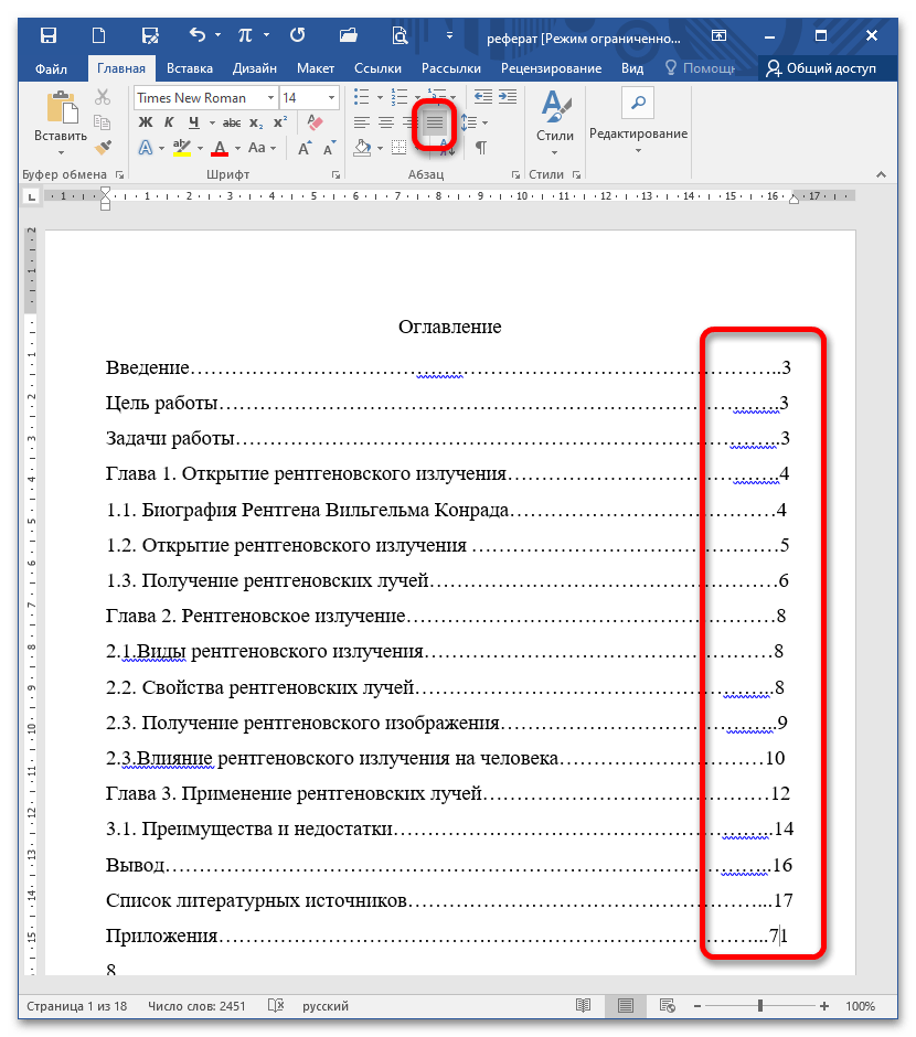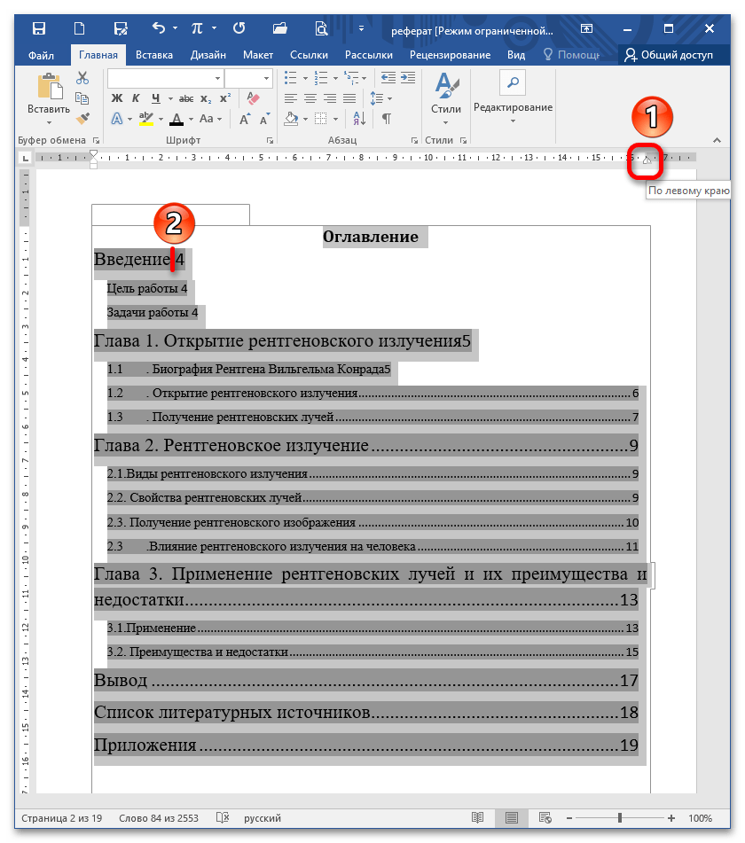 - Уберите точки во всех строках содержания, выделите редактируемый текст и кликните левой кнопкой мыши по знаку табуляции на правой границе линейки. Далее установите курсор между названием главы и номером страницы.
