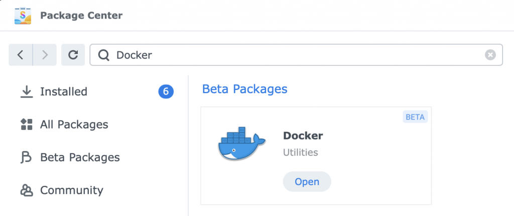 Once you are back at the main Package Center screen, you will see a search bar at the top of the application. Type in “Docker” as seen below.