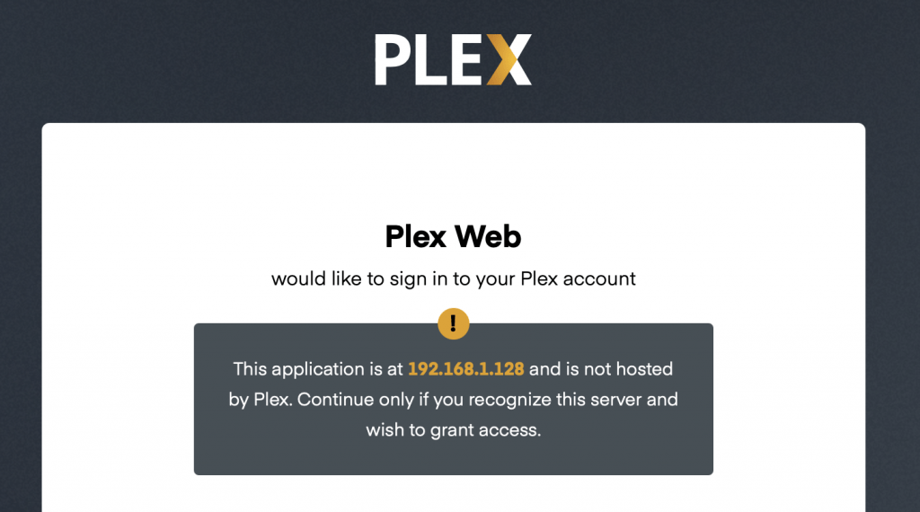 Now that you are running Plex on a Synology NAS you can access it from your browser by visiting the following URL and replacing with the IP address of your Synology NAS: . After visiting the URL for the first time you will see the Plex login screen. To access Plex from other devices, you will always use the IP address of your Docker host machine (in this case, a Synology NAS).