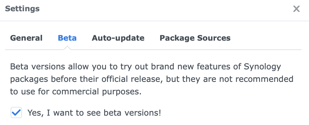 In order to download Docker, we need to enable access to Synology Beta Packages. Once the Package Center Opens, click on the “settings” button. From here you will see at tab at the top that says “Beta”. Click it and then click the checkbox for “Yes, I want to see beta versions!” to enable access to Synology Package Center applications that are in beta. Then click “ok”.