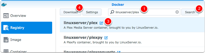 Search the official Docker registry for the Plex distribution. Click on the link to browse the documentation which informs about important switches and configuration settings. The link will take you to the Docker page for that specific image (https://hub.docker.com/r/linuxserver/plex/).
