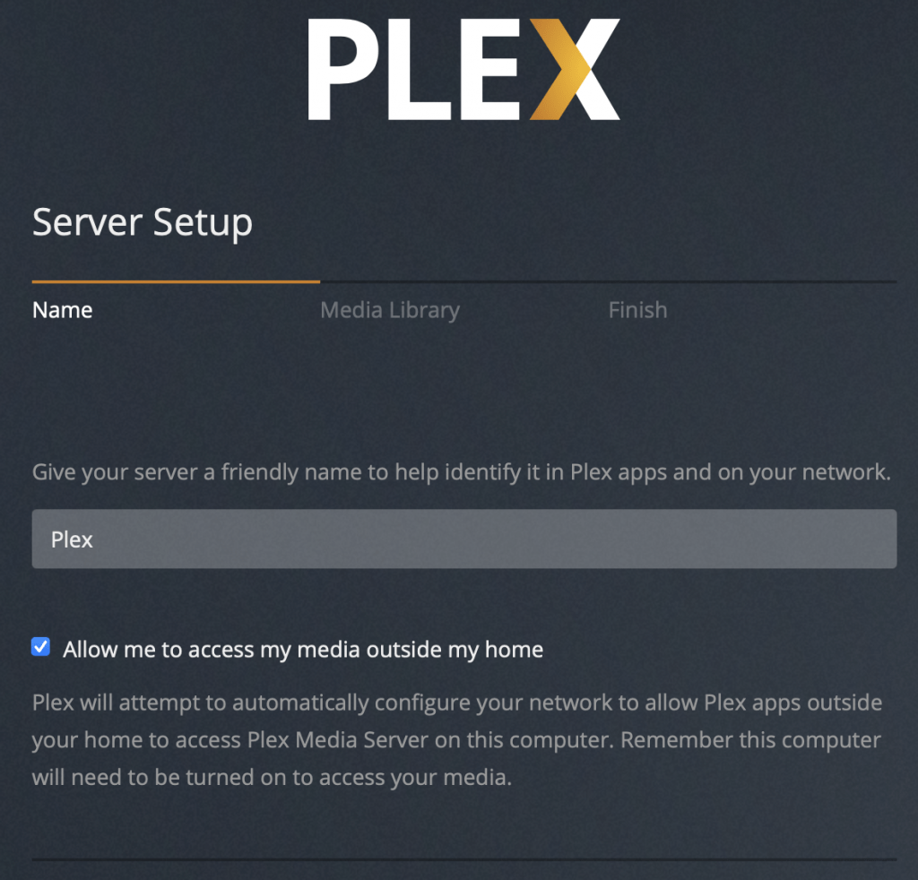 After logging in, you will be presented with the initial setup screen. Type in the name you want for your server and decide if you would like Plex to allow access to your media for you outside of your home.