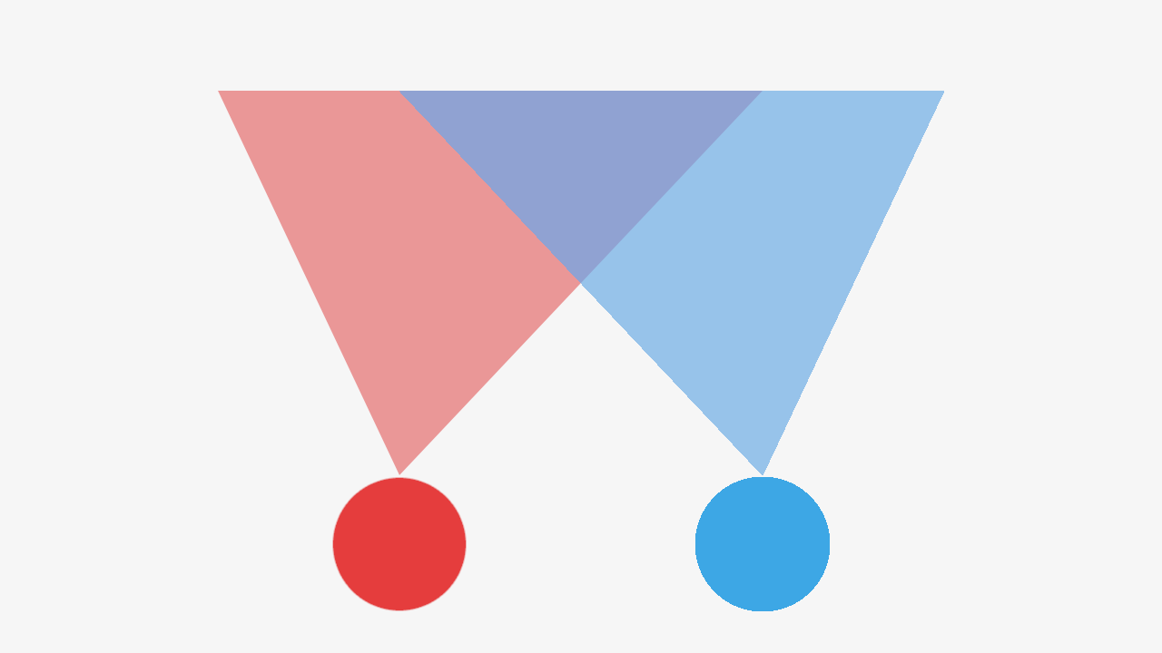 Цветами обозначены глаза и поле зрения каждого из них. Там, где поля пересекаются, образуется область, в которой мы можем воспринимать глубину. Всё остальное — периферийное зрение.