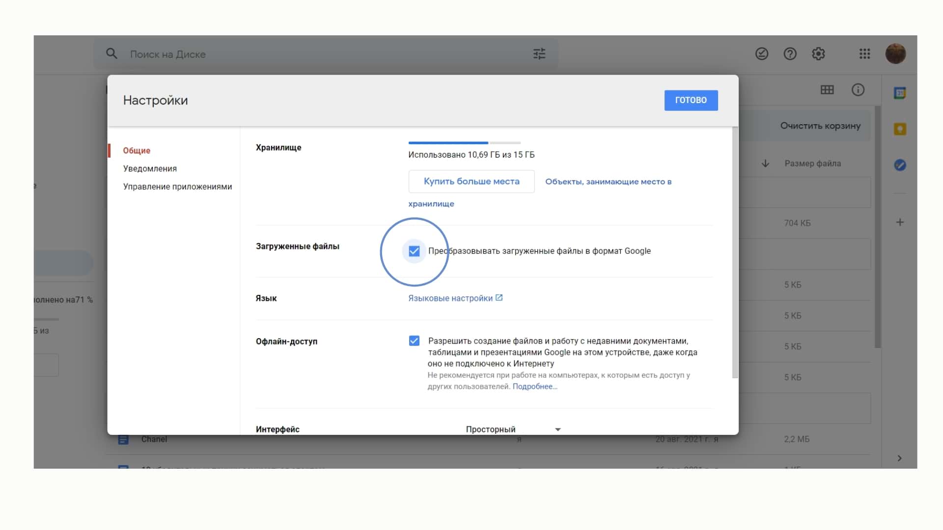 Документы от Google не занимают места. Если вы часто загружаете файлы из Microsoft Office, то настройте автоматические преобразование файлов.