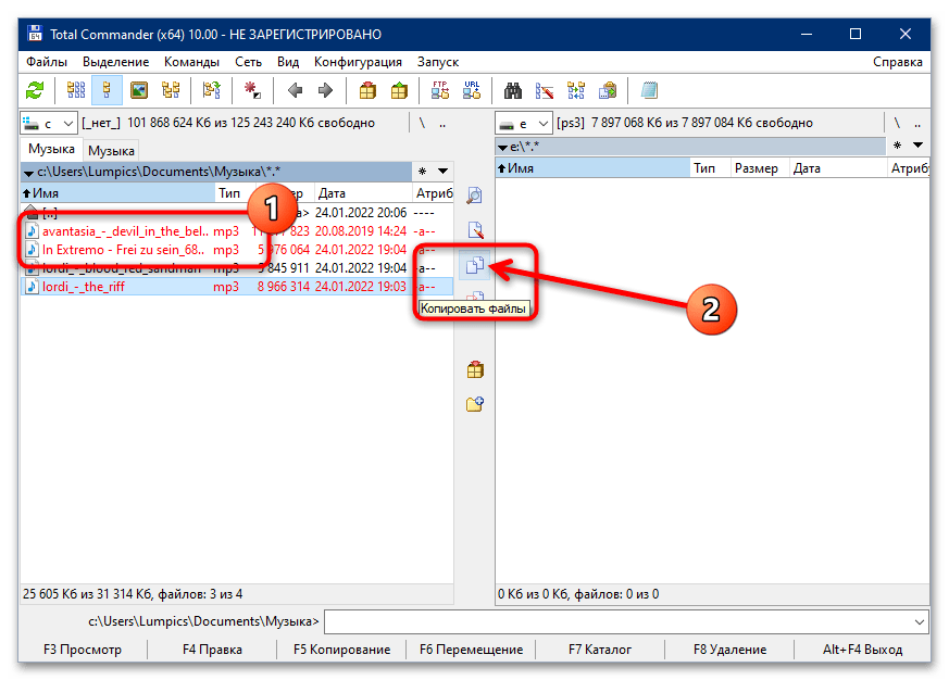 - Как и в случае с системным файловым менеджером Виндовс, в Тотал Коммандер доступны несколько вариантов выполнения рассматриваемой операции. Первым делом в левой панели откройте местоположение музыки на компьютере, в правой – корень флешки.