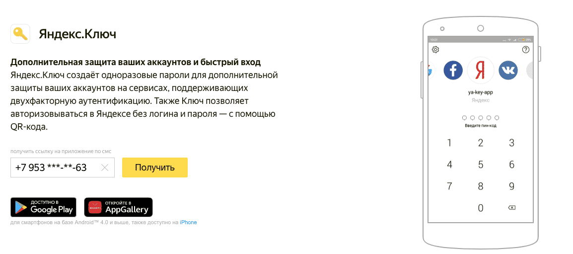 Чтобы использовать такую защиту, нужен современный телефон (смартфон) с приложением «Яндекс.Ключ».