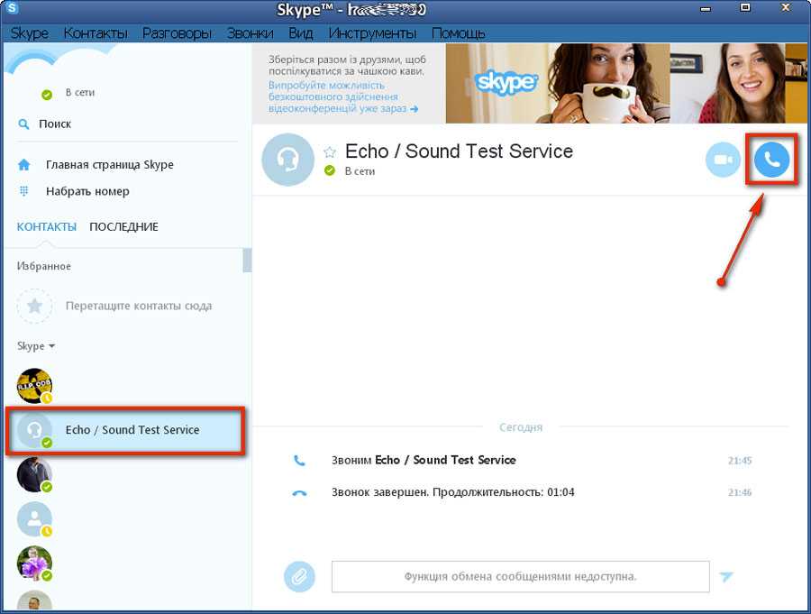 Независимо от того на каком устройстве вы используете Skype, тестовый, пробный звонок совершается на всех устройствах одинаково! В списке контактов выберите Skype Test Call. Этот особый контакт также может называться Echo / Sound Test Service или Skype Test Call (echo123) и позвонив на этот контакт следуйте указаниям которые услышите в динамике.