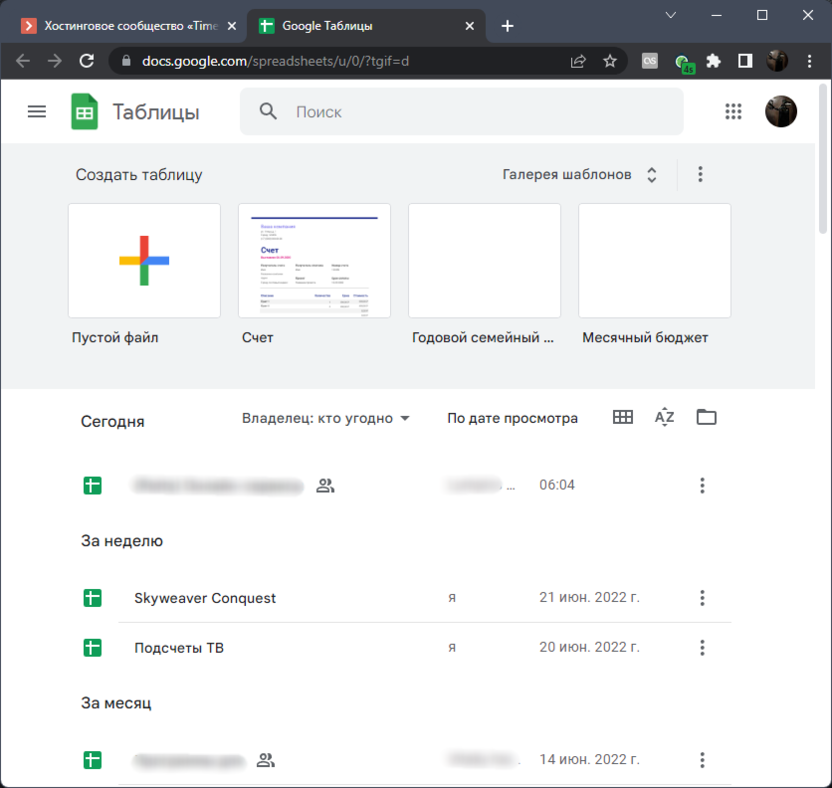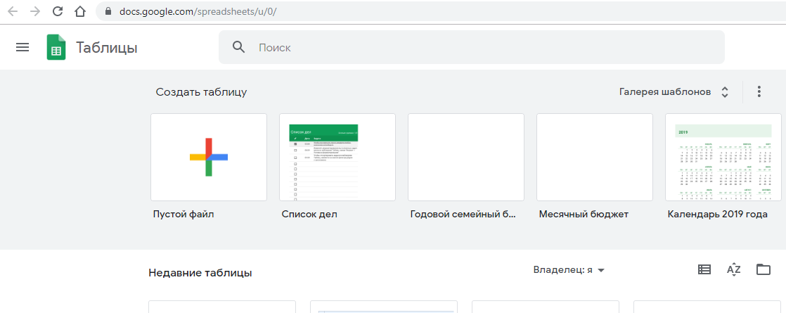 После авторизации вас встречает основное окно управления документами, в котором уже показаны созданные таблицы, шаблоны и кнопка для добавления пустого файла. Вы даже найдете средство сортировки, чтобы узнать, когда и с какими таблицами вы взаимодействовали на этом аккаунте.
