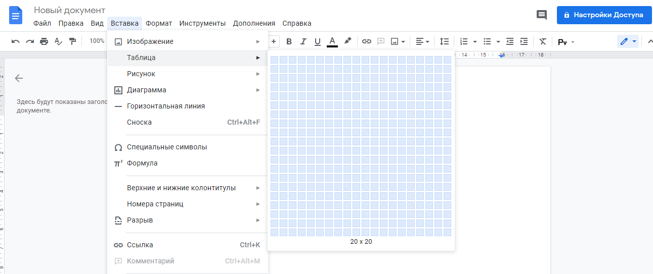 Таблицы находятся в меню «Вставка». В окне размерной сетки можно задать нужное число строк и столбцов. Максимальный размер составляет 20х20 ячеек. Такое ограничение действительно только на момент создания таблицы. Позже можно свободно добавлять и убирать элементы таблицы при необходимости.