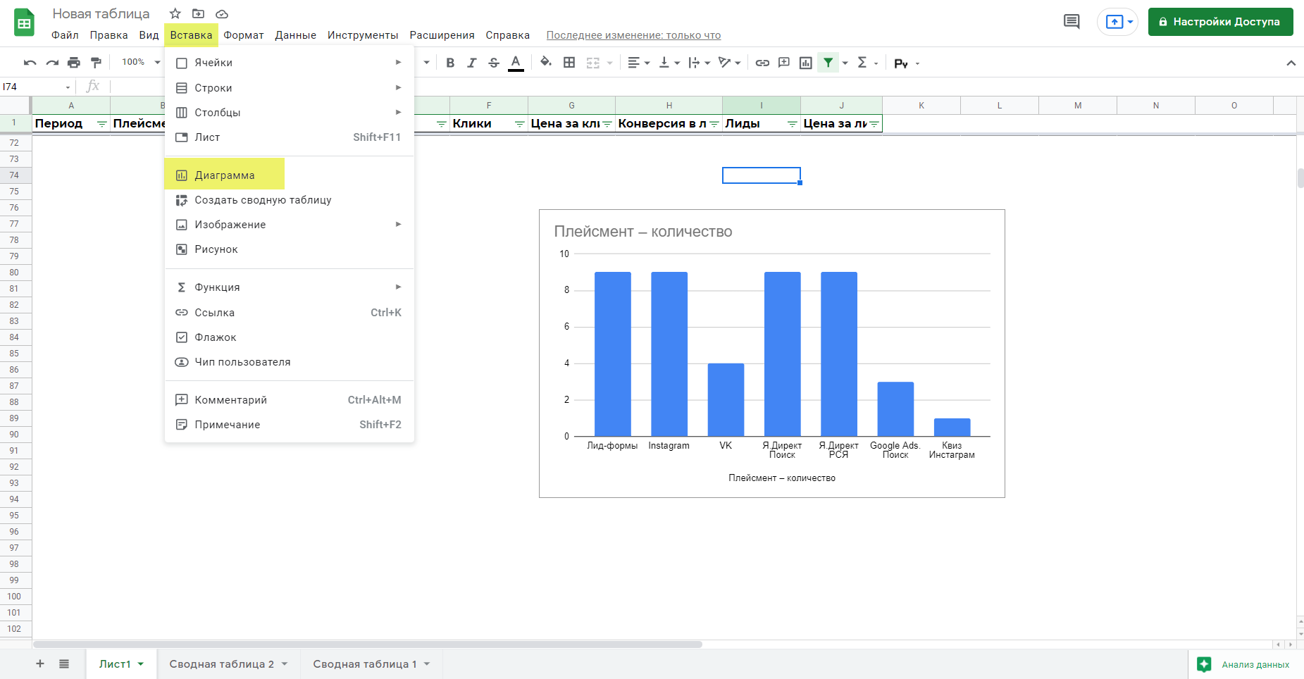 Кратко рассмотрим пункты меню Google Таблиц