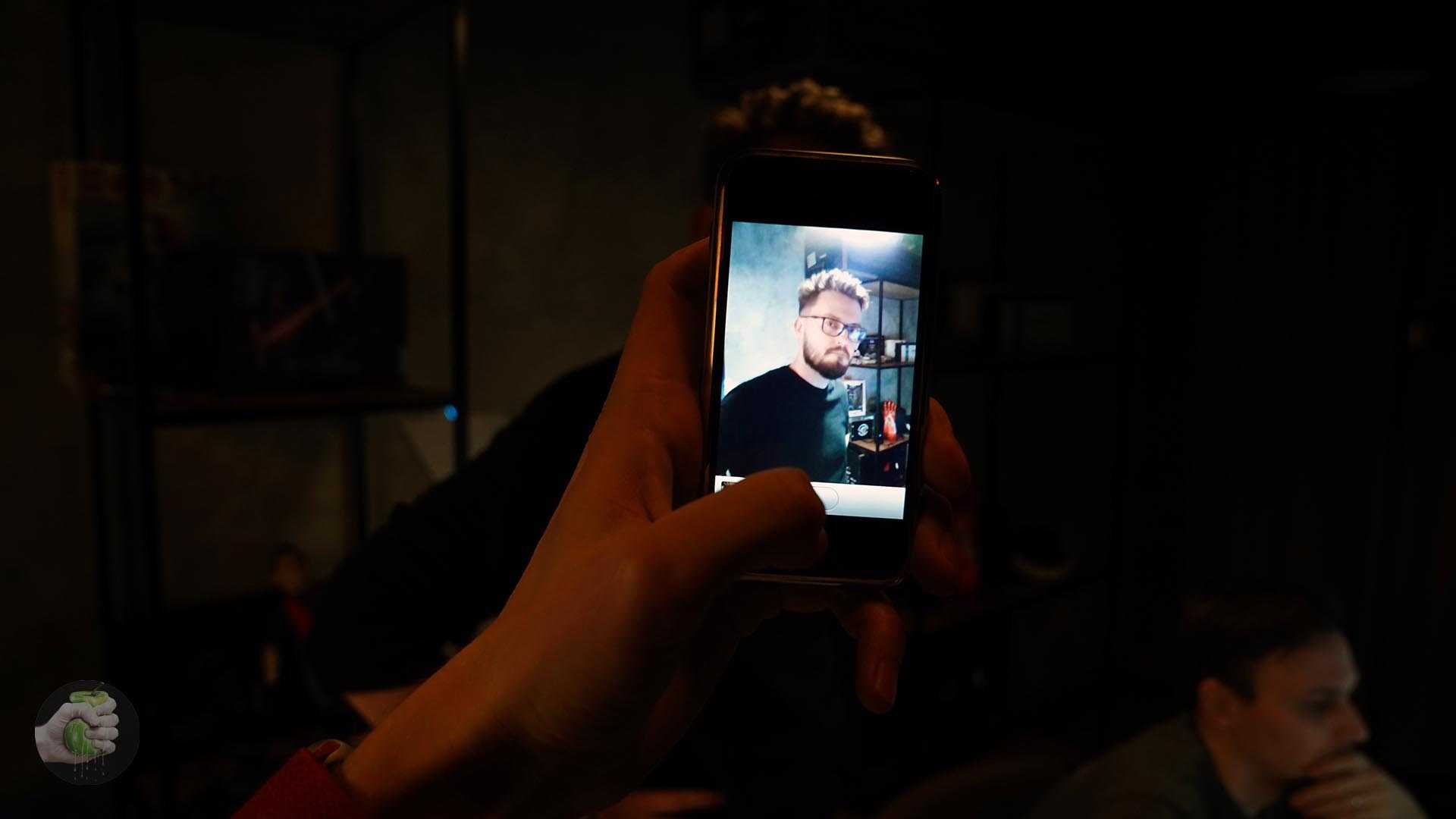 Снимок выглядит очень шумным, а из-за сложных условий освещения (чёрное помещение с большим количеством света) лицо Ильи сильно засвечено.