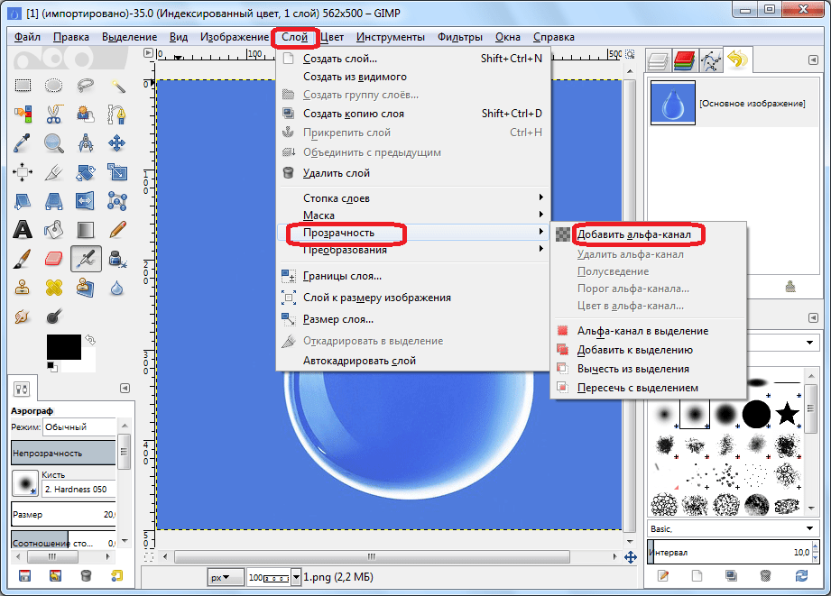 Как только файл откроется в программе, опять возвращаемся в главное меню. Последовательно кликаем на пункты «Слой» — «Прозрачность» — «Добавить альфа-канал».