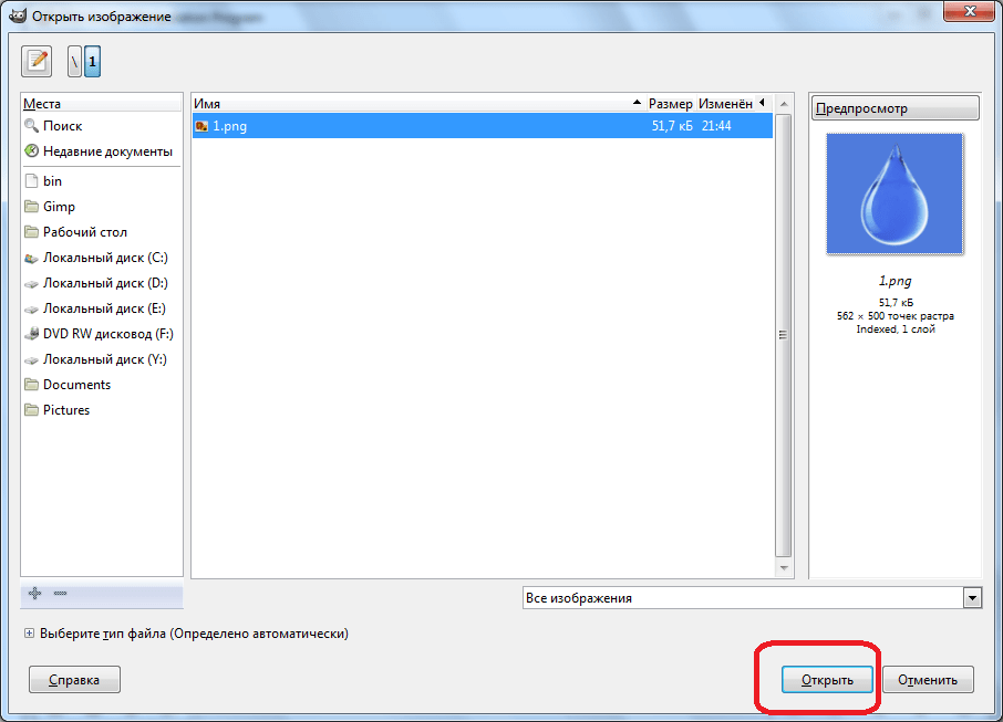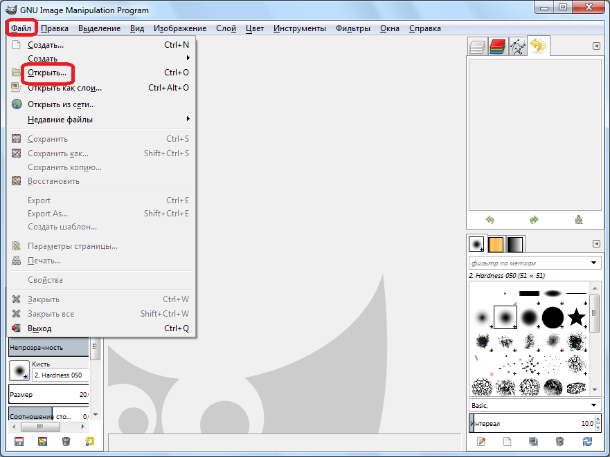Чтобы открыть любое изображение в gimp переходим в вернее меню и нажимаем пункт «Файл», далее из выпадающего меню выбираем «Открыть». В открывшемся окне, в проводнике вашей операционной системы выбираем нужную картинку и кликаем по кнопке «Открыть».