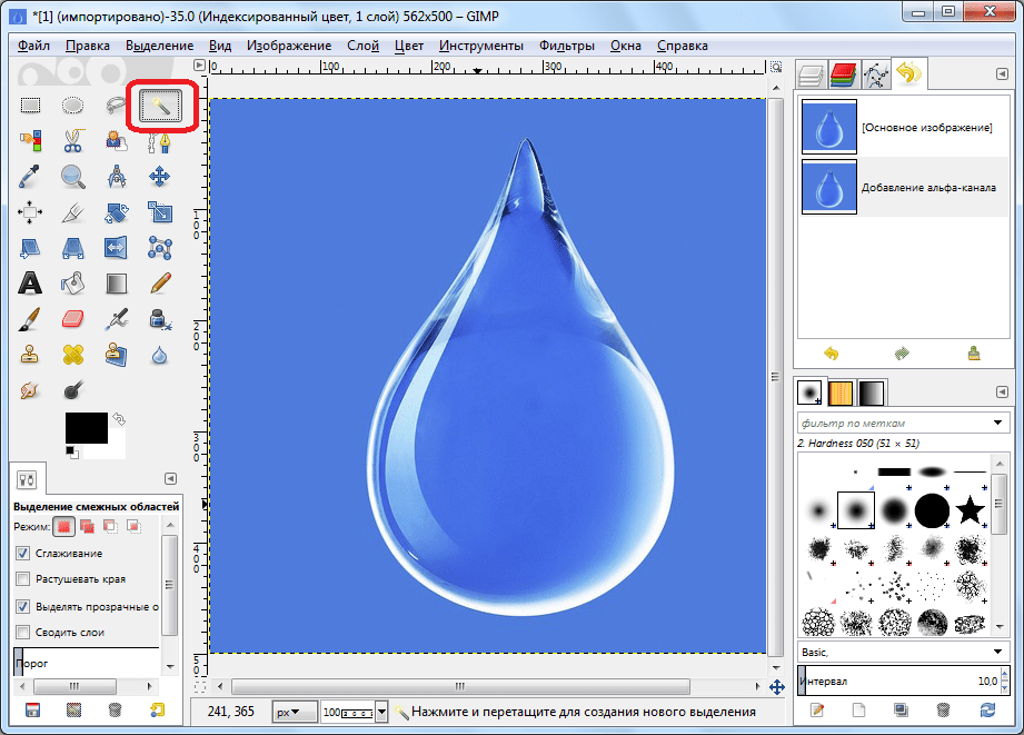 На панели инструментов Gimp выбираем инструмент «Выделение смежных областей» (еще данный инструмент называют «Волшебная палочка»).