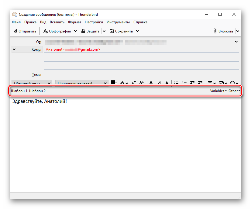 - После установки и настройки Quicktext в окне создания письма появится дополнительная панель инструментов. Здесь в один клик будут доступны ваши шаблоны, а также список всех переменных плагина.