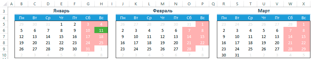 Осталось скопировать ячейки B5:H10 в другие месяца и наш автоматический календарь готов и может служить нам не один год.