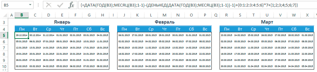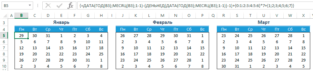 Для автоматического проставления чисел в календаре мы будем использовать всего одну формулу — формулу массива. На вид звучит страшновато, но если разобраться — все легко и просто. Выделяем ячейки B5:H10 и вводим следующую формулу (не спешим жать Enter):=ДАТА(ГОД(B3);МЕСЯЦ(B3);1-1)-(ДЕНЬНЕД(ДАТА(ГОД(B3);МЕСЯЦ(B3);1-1))-1)+{0:1:2:3:4:5:6}*7+{1;2;3;4;5;6;7}