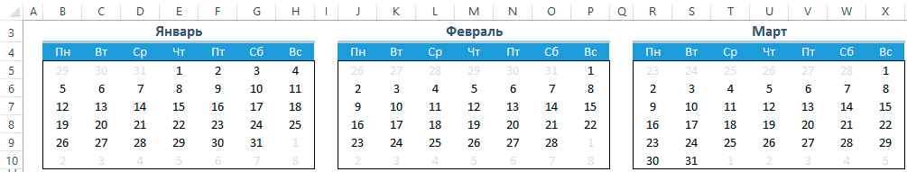 Формирование календаря в Excel
