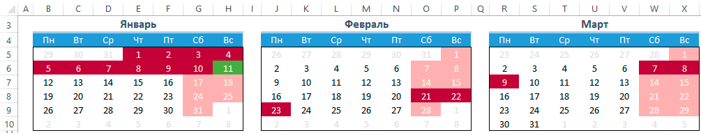 Вернемся в наш календарь и создадим еще одно правило условного форматирования. Формула условного форматирования будет проверять является ли дата праздником. И в случае если формула вернет ИСТИНА ячейка будет форматироваться. Вот эта формула:=НЕ(ЕОШИБКА(ПОИСКПОЗ(B5;ДВССЫЛ(«Праздники»);0))). Стоит отметить, что при добавлении или изменении праздничных дней, календарь будет автоматически форматироваться.
