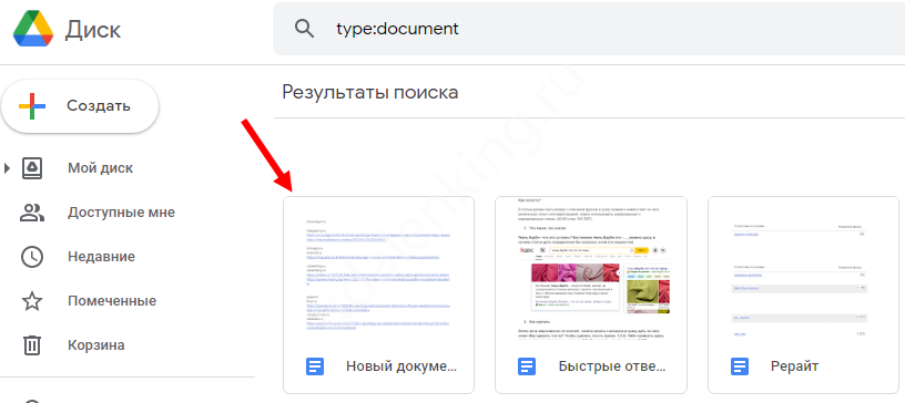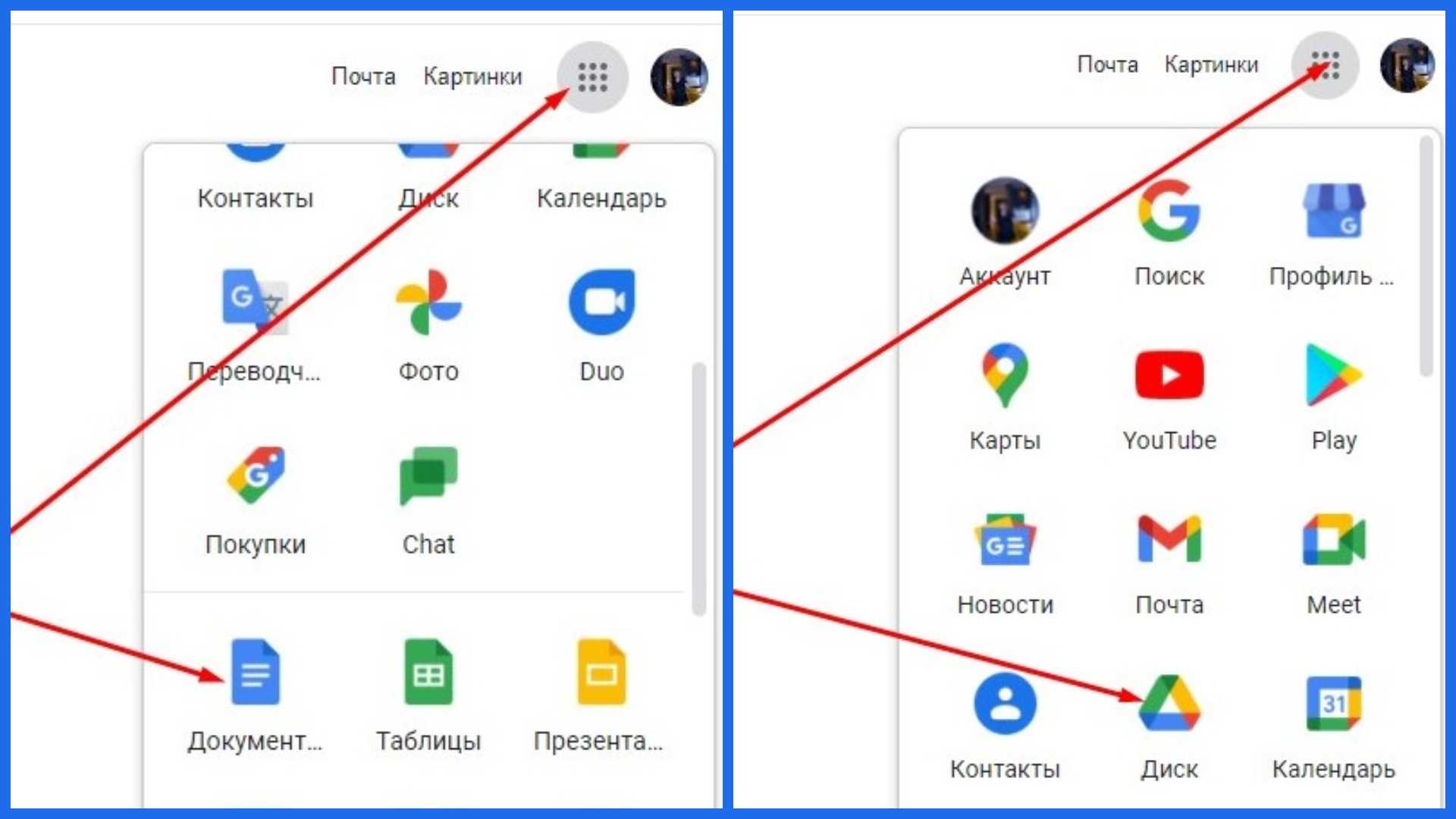 - В своем аккаунте Гугл в верхнем правом углу найдите квадрат из 9 точек рядом с аватаром. Нажмите на него и проскрольте вниз до значка Документ (синего цвета), нажав на который вы откроете страницу, на которой будет цветным крестиком отмечен новый документ. Можно начинать работу, аналогично как в редакторе Ворд.