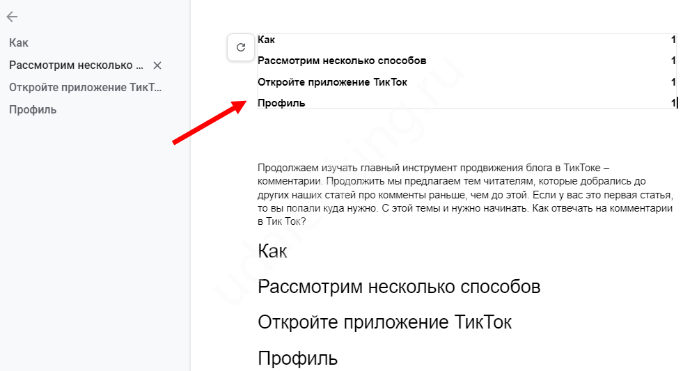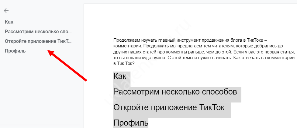 Продолжим разбираться, как сделать оглавление в Гугл Докс! После настройки на панели слева появятся отметки содержимого текста. Если нажать на любой заголовок, вы автоматически окажетесь в нужной части файла!