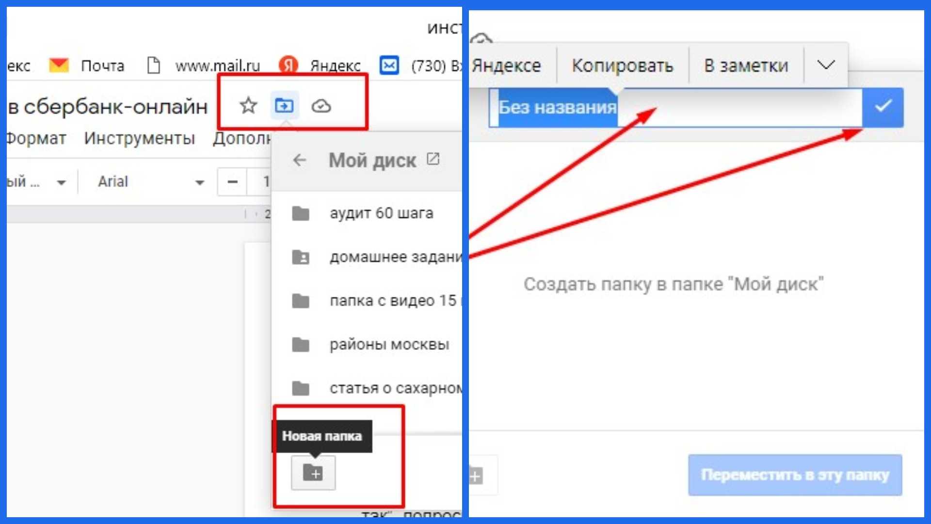 - Создать новую папку можно непосредственно в Гугл Документе. Для этого в верхней панели управления найдите значок папки рядом с обозначением облака. Нажмите на этот значок и внизу вы увидите подобный знак, но с плюсиком. Это и есть кнопка создания новой папки. Придумайте название для нее и щелкните галочку в конце строки. Новая директория готова к использованию.