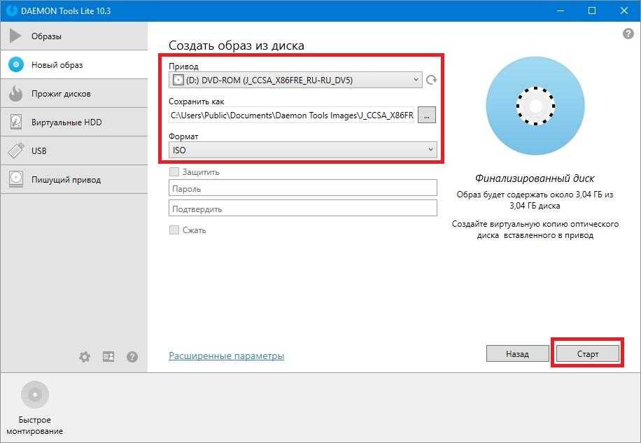 Также выберем формат image ISO и подтвердим создание, нажав кнопку Старт, что запустит создание образа DVD-диска с Windows 10.