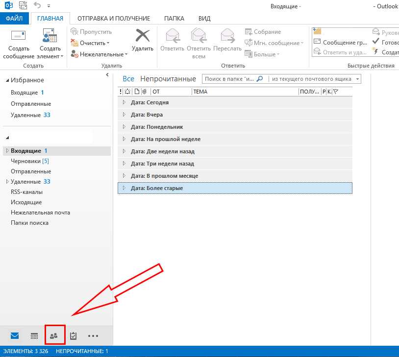 Запустите почтовое приложение Outlook, в нижней части окна с левой стороны вы легко обнаружите меню «Контакты», кликните по нему.