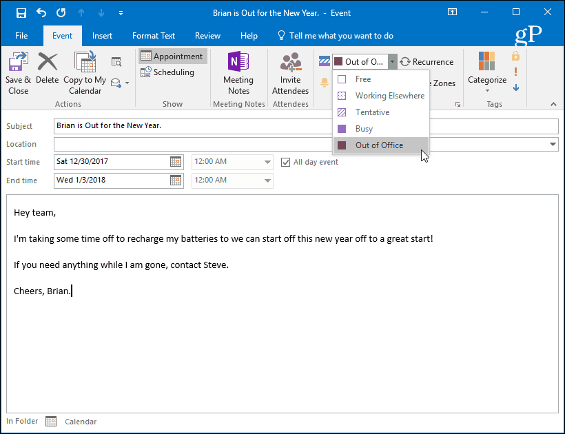 В появившемся окне введите причину, по которой вы будете вне офиса, в строке «Тема». Затем выберите подходящее время начала, когда вас не будет, и время, когда вы вернетесь. После этого обязательно перепроверьте поле «Событие на весь день». Установите в поле Показать как параметр «Нет на месте». Затем введите сообщение, которое вы хотите передать другим, когда они увидят, что вы ушли. Возможно, другой номер или человек, с которым можно связаться, пока вас нет.
