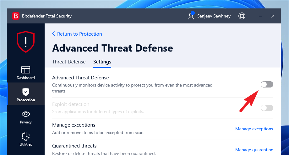 Bitdefender автоматически запустится по истечении установленного вами времени. Однако вам все равно придется вручную включать инструменты «Расширенная защита от угроз», «Брандмауэр», «Уязвимость», «Устранение программ-вымогателей» и «Защита от спама». Но если вы решили отключить его навсегда, вам нужно будет перейти к экрану «Защита» и снова включить его.