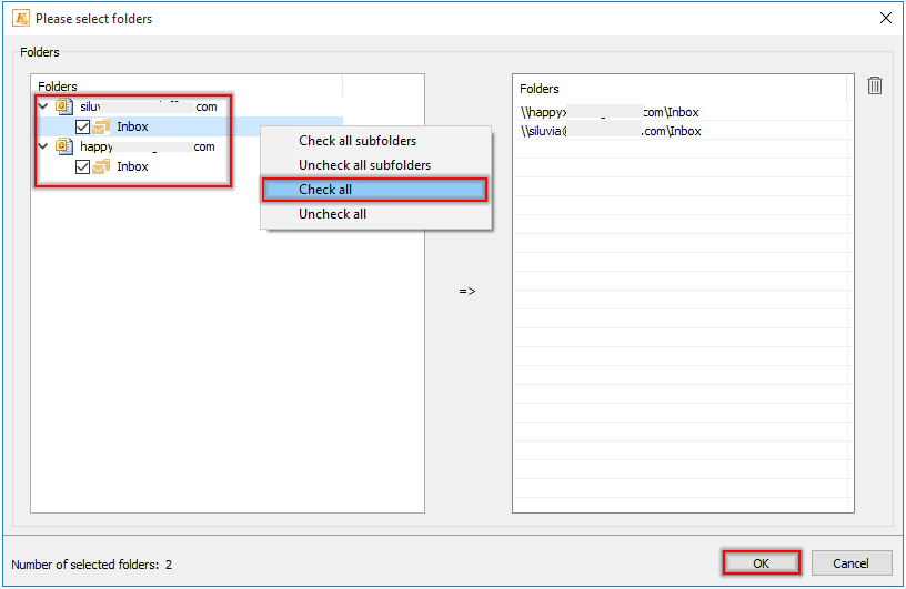 3. в Пожалуйста, выберите папки диалоговом окне, отметьте папки входящих сообщений электронной почты, которые вы объедините, или щелкните правой кнопкой мыши, чтобы выбрать Проверьте все из контекстного меню слева Папки поле, чтобы проверить все папки «Входящие» одновременно, а затем щелкните значок OK кнопка. Смотрите скриншот: