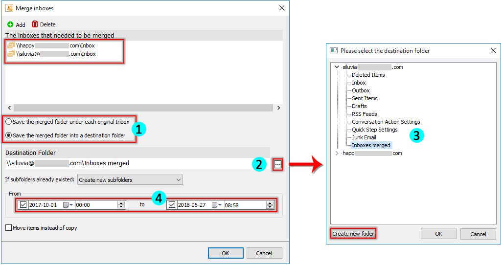 - 4.3 Выберите папку или создайте новую папку для сохранения объединенных почтовых ящиков и щелкните значок OK кнопка;