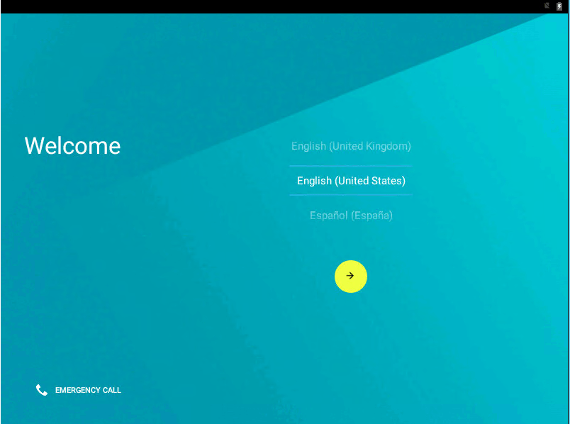 После непродолжительного процесса загрузки, вы увидите окно выбора языка, а затем — первоначальные окна настройки Android, у меня здесь работали клавиатура, мышь и тачпад на ноутбуке. Можно ничего не настраивать, а нажимать «Далее» (все равно настройки не сохранятся после перезагрузки).
